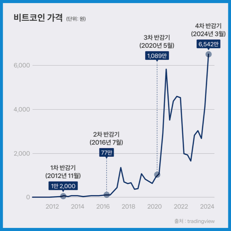 - 2020년: 12.5 → 6.25 BTC / 고점 약 $69,000