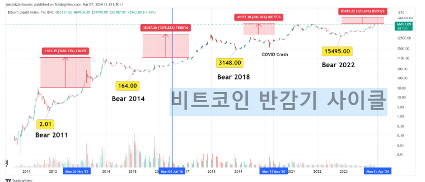 비트코인의 가격은 단기적으로는 급등락을 반복하지만, 장기적으로는 일정한 패턴을 보여왔습니다. 이른바 ‘사이클’입니다. 비트코인은 과거 4년마다 상승과 하락을 반복해왔으며, 이 사이클은 놀라울 만큼 정확하게 맞아떨어졌습니다.