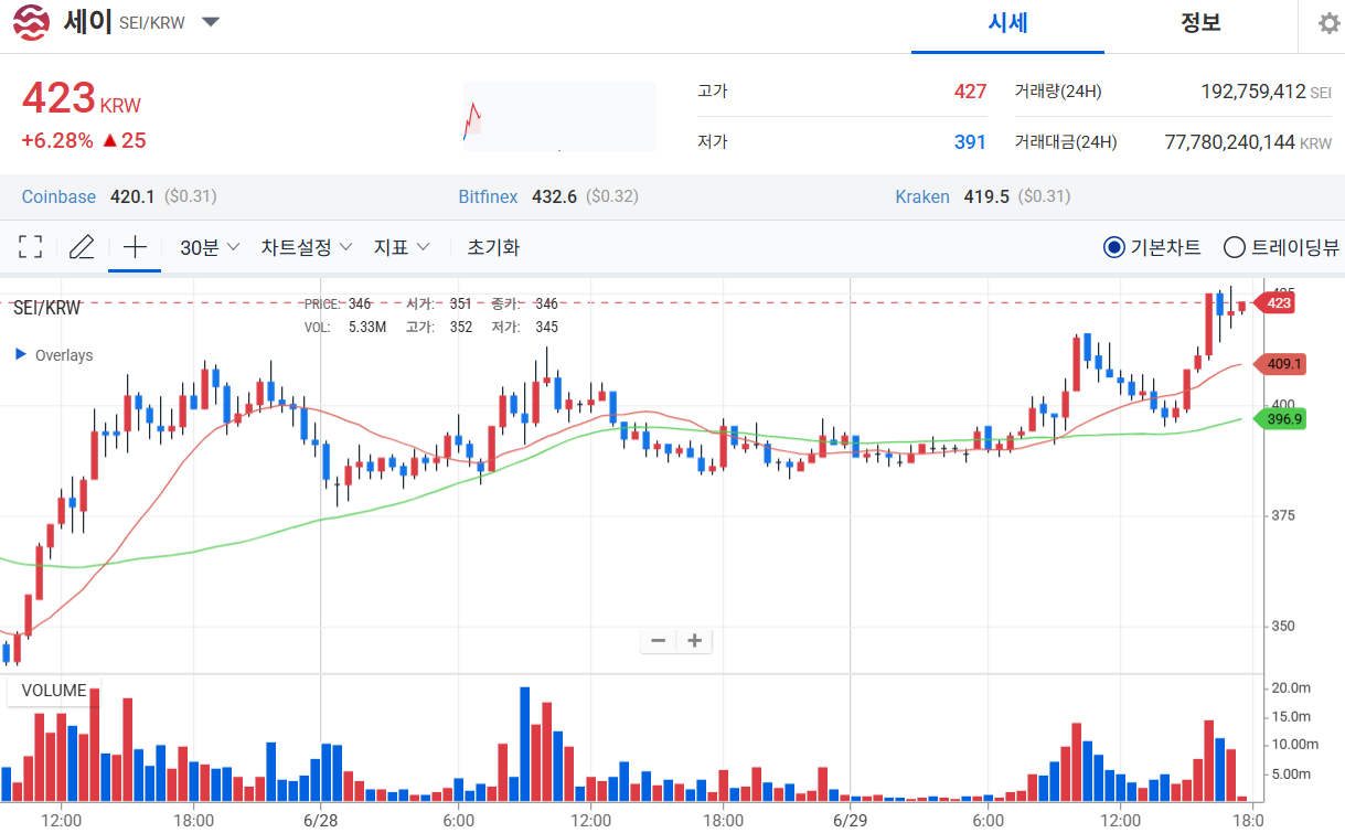 - 최근 24시간 기준 SEI 가격 33~40% 급등