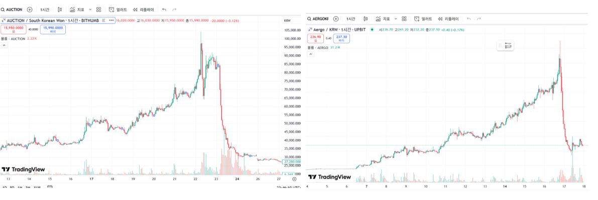 특히 눈여겨볼 점은, 이 흐름이 과거 빗썸에 상장된 Auction 코인의 차트 흐름과 매우 유사하다는 것입니다. 실제로 두 차트 모두 급등 후 거래량 없이 급락하는 패턴이 반복되고 있습니다.