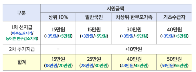 - 지원 금액 : 1인당 15~55만원 (소득별 맞춤형 지원 및 단계적 지급.)